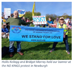 Our congregation is diverse geographically, with folks living in Orange, Ulster and Dutchess Counties as well as NYC. This was evident on October 18, when many members and friends showed up to the NO KINGS protests and rallies in Cornwall, Goshen, Kingston, Newburgh and Beacon.