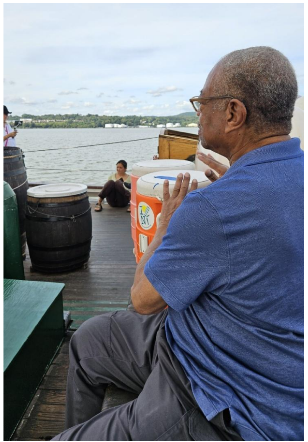 UUCRT President Markly Wilson drums for Climate Justice. In September Markly and Linda Mangelsdorf joined the Climate Pilgrimage (Taina Asili and Fever Pitch--walkers from Albany to NYC to raise concern about Climate Justice). Photo taken by Linda aboard the sloop Clearwater as it stops at Cold Spring.